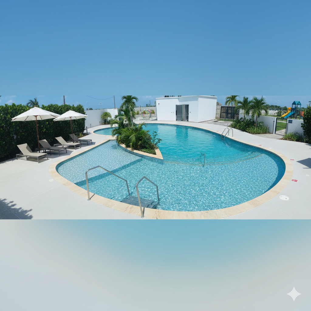 Compuesta por: piscina de adultos en forma de ojo con camas balinesas, piscina de niños con chorro tipo arco. Dos jacuzzis climatizados, cabina para baño turco y cabina para baños sauna