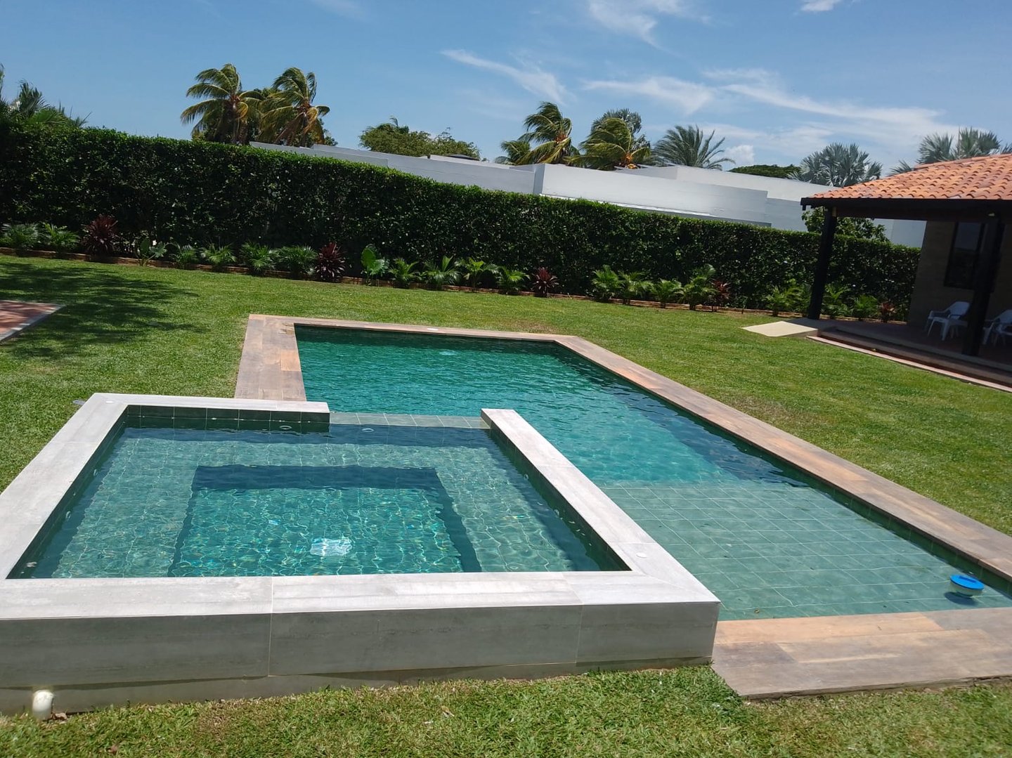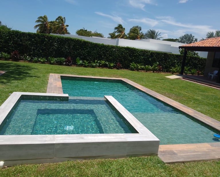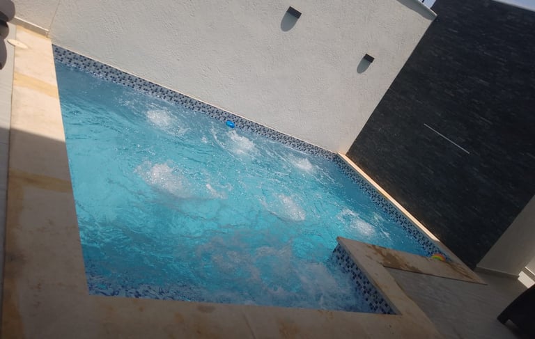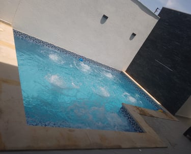 Piscina con jacuzzi climatizado con sistema de blower y sistemas de hidrojets. Alimentado por una planta de tratamiento de agua proveniente de un pozo artesano